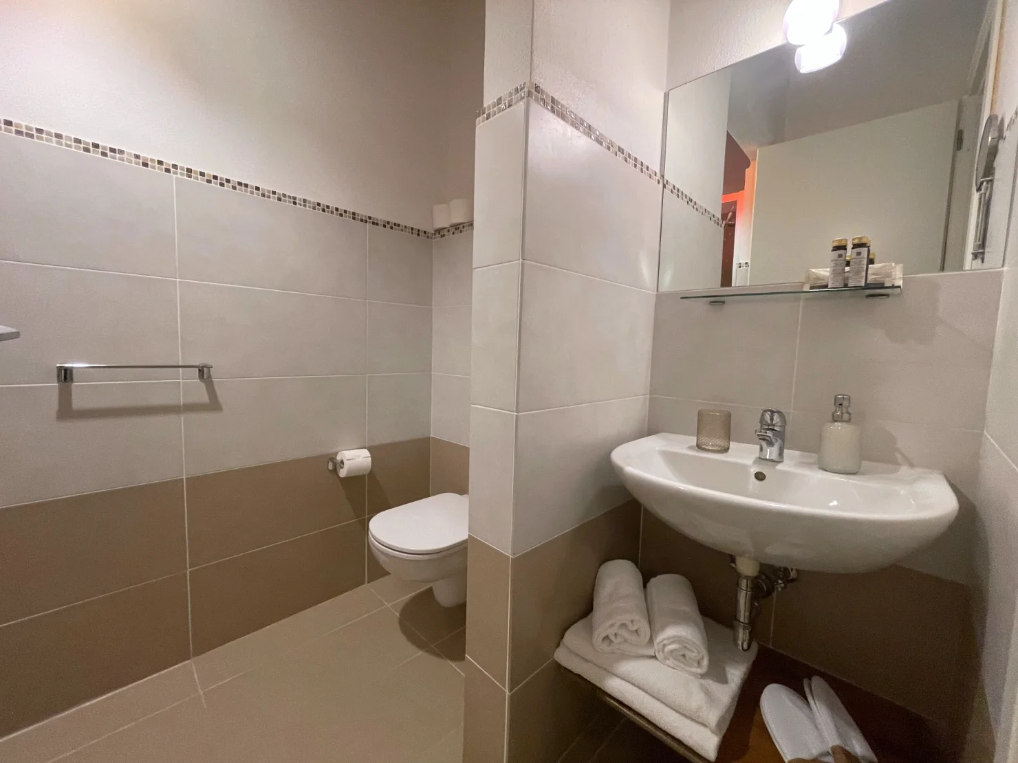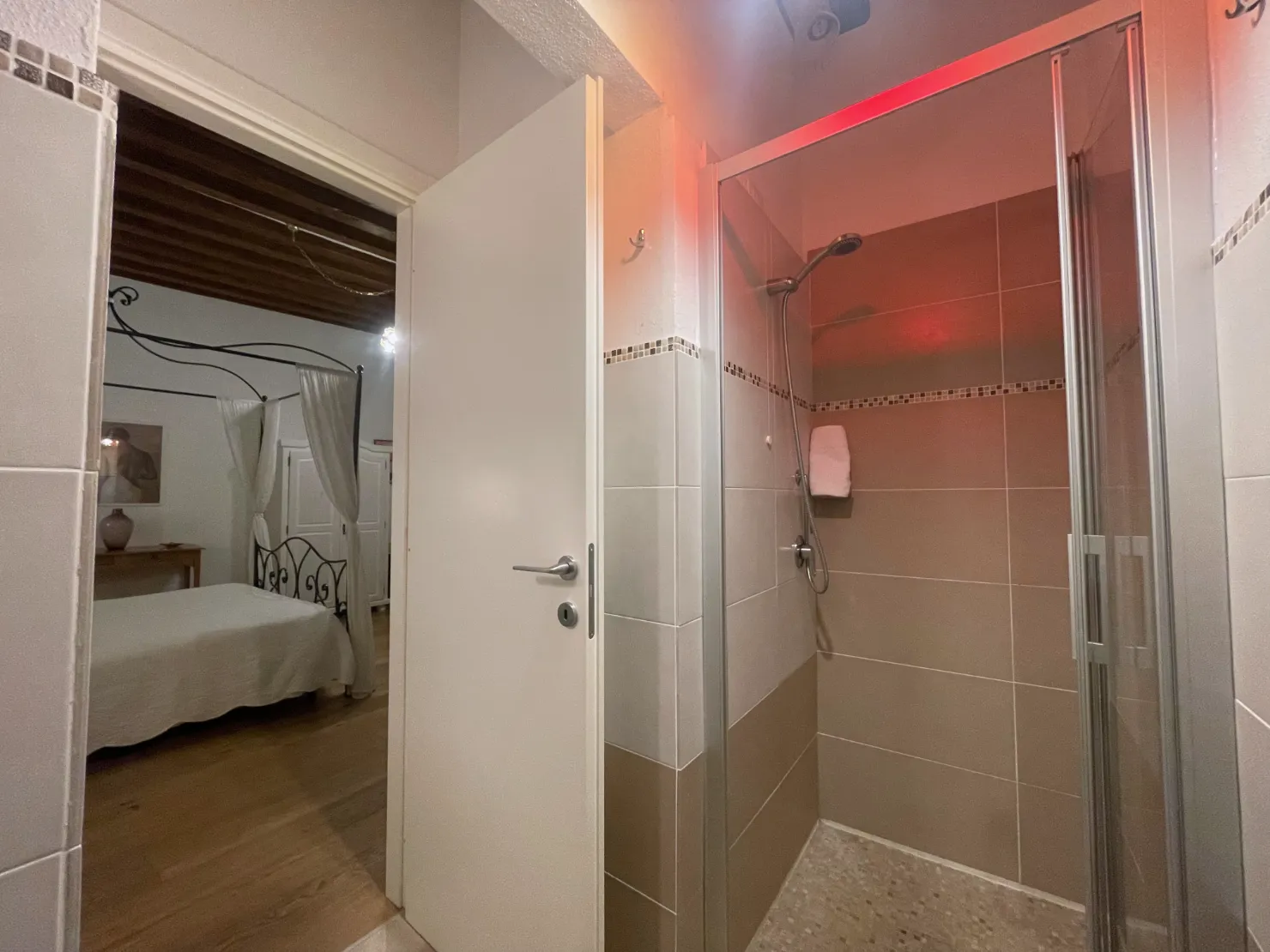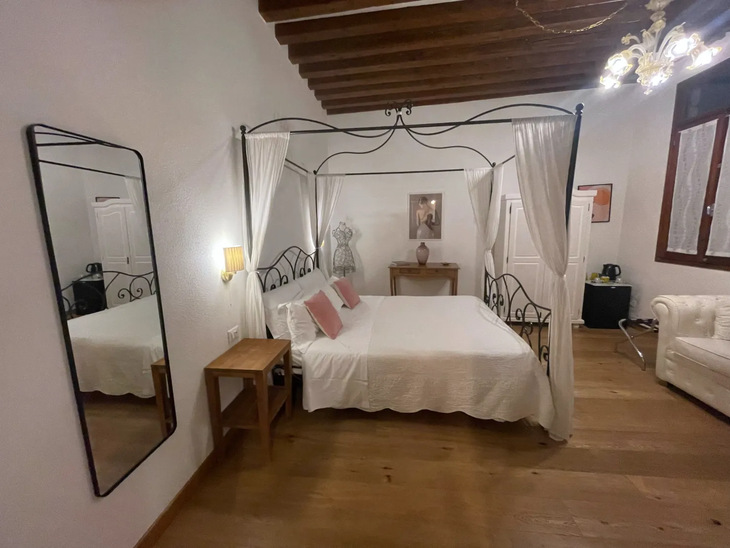 Spaziosa camera con travi a vista dell’alto soffitto tipico della Venezia antica, letto a baldacchino e piacevole vista su calle del frutariol che la rendono elegante ed accogliente. Questa ampia camera di circa 25 metri quadrati è dotata, tv, wifi, aria condizionata, riscaldamento autonomo, bagno privato con doccia, asciugacapelli, asciugamani e linea cortesia.